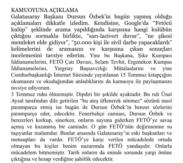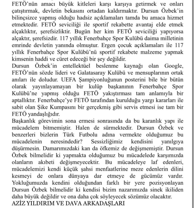 FETÖ’nün amacı büyük kitleleri karşı karşıya getirmek ve onları çatıştırmak, devletin bekasını ortadan kaldırmaktır. Dursun Özbek’in bilinçsizce yapmış olduğu hadsiz açıklamaları tamda bu amaca hizmet etmektedir. FETÖ seviciliği ile sportif rekabette avantaj elde etmek alçaklıktır, şerefsizliktir. Bugün her kim FETÖ seviciliği yapıyorsa alçaktır, şerefsizdir. 117 yıllık Fenerbahçe Spor Kulübü daima milletinin emrinde devletin yanında olmuştur. Ergen çocuk açıklamaları ile 117 yıllık Fenerbahçe Spor Kulübü’nü sportif rekabete malzeme yapmak kimsenin haddi ve cüret edeceği bir şey değildir.